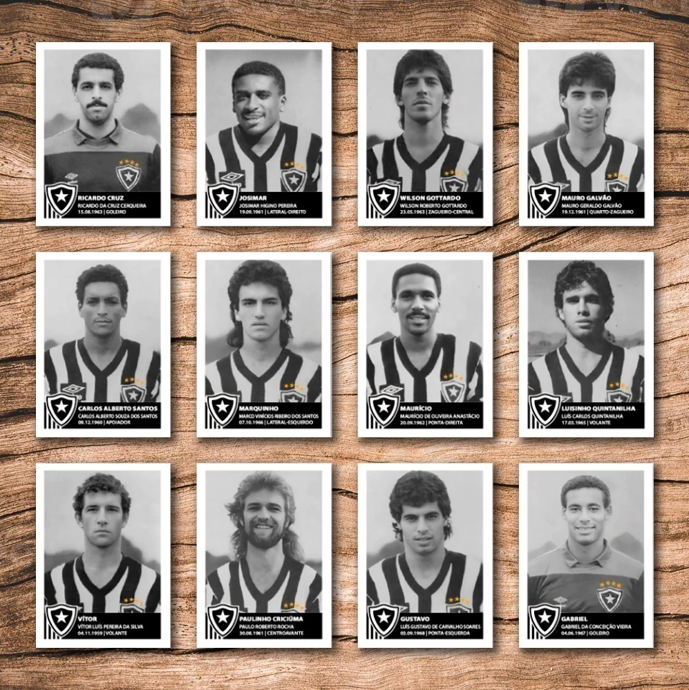 <table data-header-hidden><thead><tr><th align="center"></th><th align="center" valign="top"></th></tr></thead><tbody><tr><td align="center"><strong>Nº</strong></td><td align="center" valign="top"><strong>Descrição</strong></td></tr><tr><td align="center">1</td><td align="center" valign="top">Ricardo Cruz</td></tr><tr><td align="center">2</td><td align="center" valign="top">Josimar</td></tr><tr><td align="center">3</td><td align="center" valign="top">Wilson Gottardo</td></tr><tr><td align="center">4</td><td align="center" valign="top">Mauro Galvão</td></tr><tr><td align="center">5</td><td align="center" valign="top">Carlos alberto Santos</td></tr><tr><td align="center">6</td><td align="center" valign="top">Marquinho</td></tr><tr><td align="center">7</td><td align="center" valign="top">Maurício</td></tr><tr><td align="center">8</td><td align="center" valign="top">Luisinho Quintanilha</td></tr><tr><td align="center">9</td><td align="center" valign="top">Vítor</td></tr><tr><td align="center">10</td><td align="center" valign="top">Paulinho Criciúma</td></tr><tr><td align="center">11</td><td align="center" valign="top">Gustavo</td></tr><tr><td align="center">12</td><td align="center" valign="top">Gabriel</td></tr><tr><td align="center">13</td><td align="center" valign="top">Mongol</td></tr><tr><td align="center">14</td><td align="center" valign="top">Wanderlei</td></tr><tr><td align="center">15</td><td align="center" valign="top">Milton Cruz</td></tr><tr><td align="center">16</td><td align="center" valign="top">Mazolinha</td></tr><tr><td align="center">17</td><td align="center" valign="top">Renato Martins</td></tr><tr><td align="center">18</td><td align="center" valign="top">Varela</td></tr><tr><td align="center">19</td><td align="center" valign="top">Jocimar</td></tr><tr><td align="center">20</td><td align="center" valign="top">Marinho</td></tr><tr><td align="center">21</td><td align="center" valign="top">Jéferson</td></tr><tr><td align="center">22</td><td align="center" valign="top">William Bacana</td></tr><tr><td align="center">23</td><td align="center" valign="top">Carlos Magno</td></tr><tr><td align="center">24</td><td align="center" valign="top">Luiz Cláudio</td></tr><tr><td align="center">25</td><td align="center" valign="top">Edilson</td></tr><tr><td align="center">26</td><td align="center" valign="top">Valdir Espinosa</td></tr><tr><td align="center">27</td><td align="center" valign="top">Emil Pinheiro</td></tr><tr><td align="center">28</td><td align="center" valign="top">Foto Placar</td></tr><tr><td align="center">29</td><td align="center" valign="top">Time Posado</td></tr><tr><td align="center">30</td><td align="center" valign="top">Pato Donald</td></tr><tr><td align="center">31</td><td align="center" valign="top">Camisa Goleiro</td></tr><tr><td align="center">32</td><td align="center" valign="top">Camisa Reserva</td></tr><tr><td align="center">33</td><td align="center" valign="top">Camisa Listrada</td></tr><tr><td align="center">34</td><td align="center" valign="top">Paulinho Criciúma (autografado)</td></tr><tr><td align="center">35</td><td align="center" valign="top">Mauro Galvão (autografado)</td></tr><tr><td align="center">36</td><td align="center" valign="top">Maurício (autografado)</td></tr></tbody></table>
