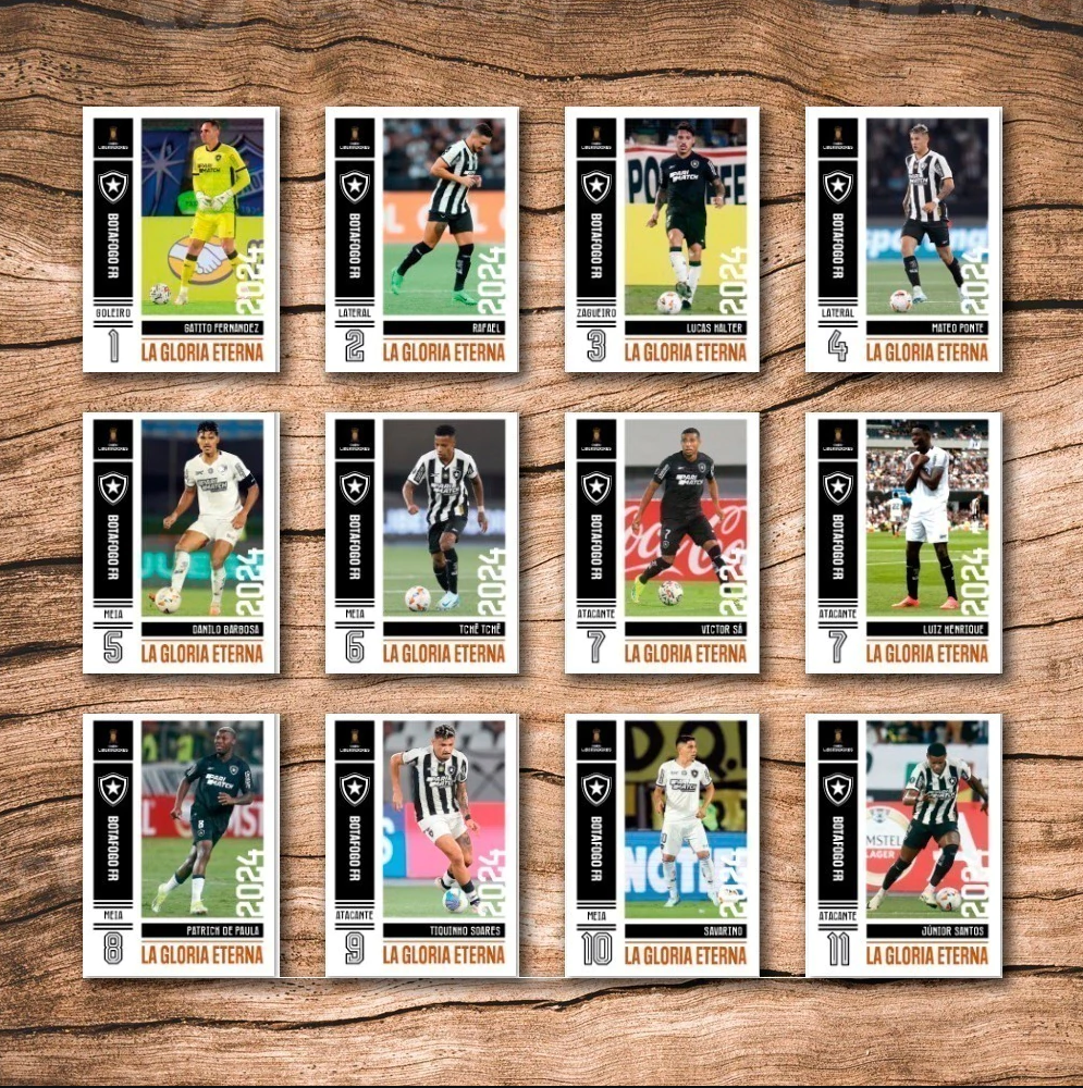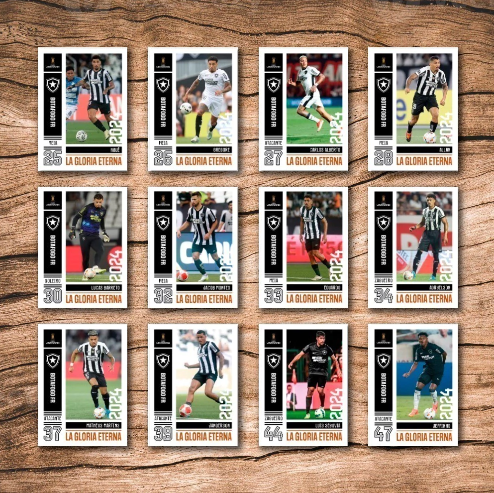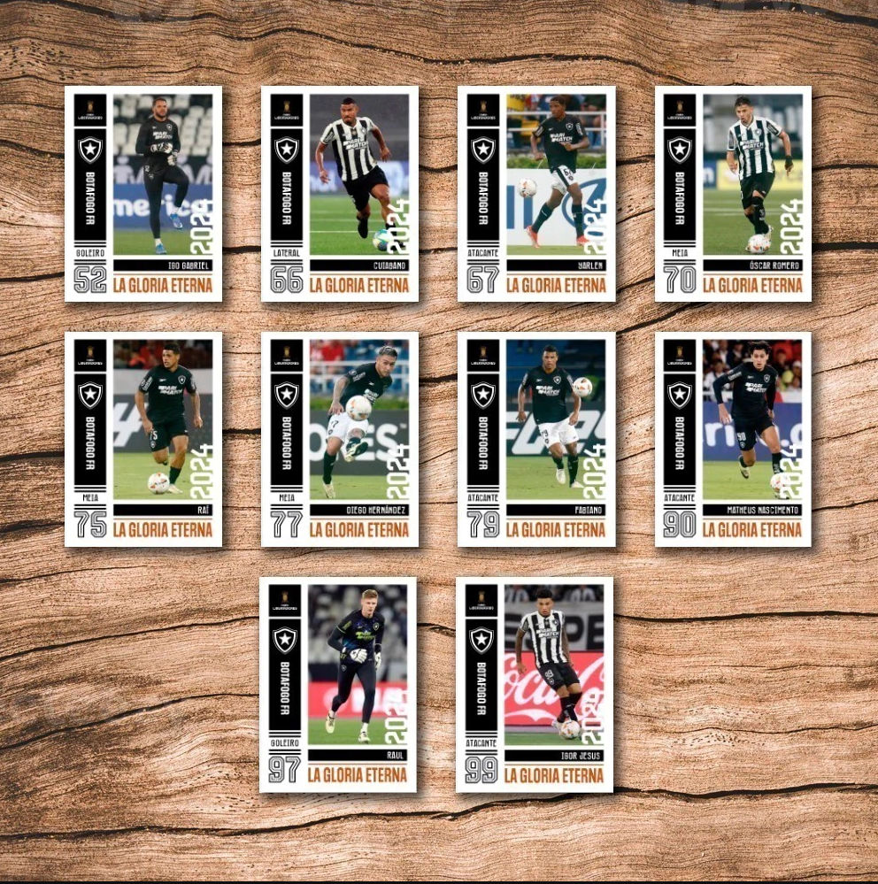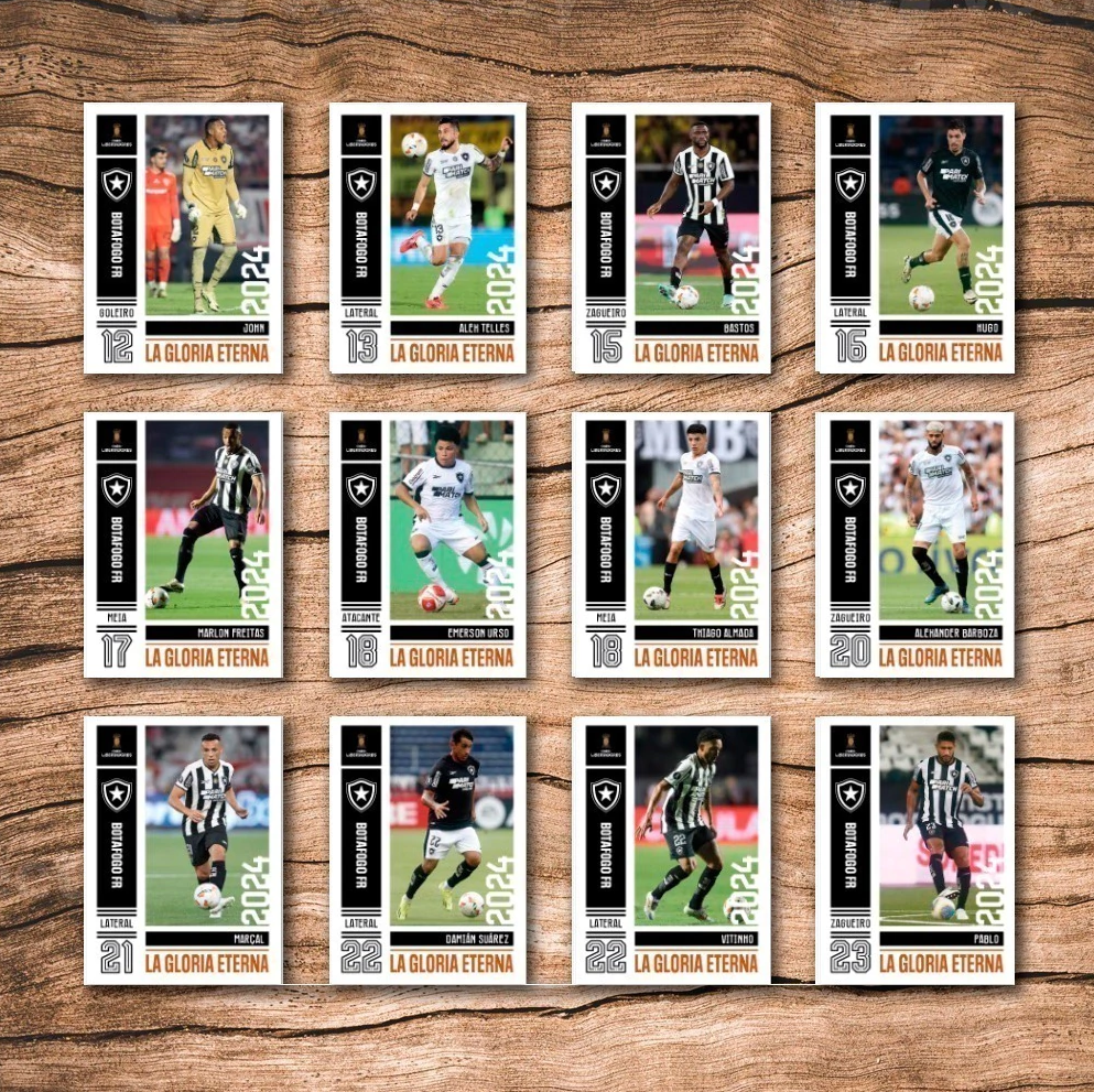 <table data-header-hidden><thead><tr><th align="center"></th><th align="center" valign="top"></th></tr></thead><tbody><tr><td align="center"><strong>Nº</strong></td><td align="center" valign="top"><strong>Descrição</strong></td></tr><tr><td align="center">1</td><td align="center" valign="top">Gatito Fernández</td></tr><tr><td align="center">2</td><td align="center" valign="top">Rafael</td></tr><tr><td align="center">3</td><td align="center" valign="top">Lucas Halter</td></tr><tr><td align="center">4</td><td align="center" valign="top">Mateo Ponte</td></tr><tr><td align="center">5</td><td align="center" valign="top">Danilo Barbosa</td></tr><tr><td align="center">6</td><td align="center" valign="top">Tchê Tchê</td></tr><tr><td align="center">7</td><td align="center" valign="top">Victor Sá</td></tr><tr><td align="center">8</td><td align="center" valign="top">Luiz Henrique</td></tr><tr><td align="center">9</td><td align="center" valign="top">Patrick de Paula</td></tr><tr><td align="center">10</td><td align="center" valign="top">Tiquinho Soares</td></tr><tr><td align="center">11</td><td align="center" valign="top">Savarino</td></tr><tr><td align="center">12</td><td align="center" valign="top">Júnior Santos</td></tr><tr><td align="center">13</td><td align="center" valign="top">John</td></tr><tr><td align="center">14</td><td align="center" valign="top">Alex Telles</td></tr><tr><td align="center">15</td><td align="center" valign="top">Bastos</td></tr><tr><td align="center">16</td><td align="center" valign="top">Hugo</td></tr><tr><td align="center">17</td><td align="center" valign="top">Marlon Freitas</td></tr><tr><td align="center">18</td><td align="center" valign="top">Emerson Urso</td></tr><tr><td align="center">19</td><td align="center" valign="top">Thiago Almada</td></tr><tr><td align="center">20</td><td align="center" valign="top">Alexander Barboza</td></tr><tr><td align="center">21</td><td align="center" valign="top">Marçal</td></tr><tr><td align="center">22</td><td align="center" valign="top">Damían Suárez</td></tr><tr><td align="center">23</td><td align="center" valign="top">Vitinho</td></tr><tr><td align="center">24</td><td align="center" valign="top">Pablo</td></tr><tr><td align="center">25</td><td align="center" valign="top">Kauê</td></tr><tr><td align="center">26</td><td align="center" valign="top">Gregore</td></tr><tr><td align="center">27</td><td align="center" valign="top">Carlos Alberto</td></tr><tr><td align="center">28</td><td align="center" valign="top">Allan</td></tr><tr><td align="center">29</td><td align="center" valign="top">Lucas Barreto</td></tr><tr><td align="center">30</td><td align="center" valign="top">Jacob Montes</td></tr><tr><td align="center">31</td><td align="center" valign="top">Eduardo</td></tr><tr><td align="center">32</td><td align="center" valign="top">Adryelson</td></tr><tr><td align="center">33</td><td align="center" valign="top">Matheus Martins</td></tr><tr><td align="center">34</td><td align="center" valign="top">Janderson</td></tr><tr><td align="center">35</td><td align="center" valign="top">Luís Segóvia</td></tr><tr><td align="center">36</td><td align="center" valign="top">Jeffinho</td></tr><tr><td align="center">37</td><td align="center" valign="top">Igo Gabriel</td></tr><tr><td align="center">38</td><td align="center" valign="top">Cuiabano</td></tr><tr><td align="center">39</td><td align="center" valign="top">Yarlen</td></tr><tr><td align="center">40</td><td align="center" valign="top">Óscar Romero</td></tr><tr><td align="center">41</td><td align="center" valign="top">Raí</td></tr><tr><td align="center">42</td><td align="center" valign="top">Diego Hernández</td></tr><tr><td align="center">43</td><td align="center" valign="top">Fabiano</td></tr><tr><td align="center">44</td><td align="center" valign="top">Matheus Nascimento</td></tr><tr><td align="center">45</td><td align="center" valign="top">Raul</td></tr><tr><td align="center">46</td><td align="center" valign="top">Igor Jesus</td></tr><tr><td align="center">47</td><td align="center" valign="top">Arthur Jorge</td></tr><tr><td align="center">48</td><td align="center" valign="top">Jogadores Diversos 1</td></tr><tr><td align="center">49</td><td align="center" valign="top">Jogadores Diversos 2</td></tr><tr><td align="center">50</td><td align="center" valign="top">Time Posado</td></tr><tr><td align="center">51</td><td align="center" valign="top">Luiz Henrique (especial)</td></tr><tr><td align="center">52</td><td align="center" valign="top">Júnior Santos (especial)</td></tr><tr><td align="center">53</td><td align="center" valign="top">Alexander Barboza (especial)</td></tr><tr><td align="center">54</td><td align="center" valign="top">Time Campeão (especial)</td></tr></tbody></table>